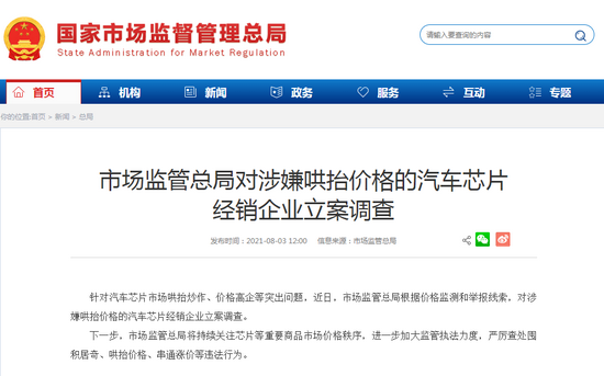 【IT时代网综合报道】依据国家市场监管总局网站披露,针对汽车芯片市场哄抬炒作、价格高企等突出问题,近日,市场监管总局根据价格监测和举报线索,对涉嫌哄抬价格的汽车芯片经销企业立案调查。