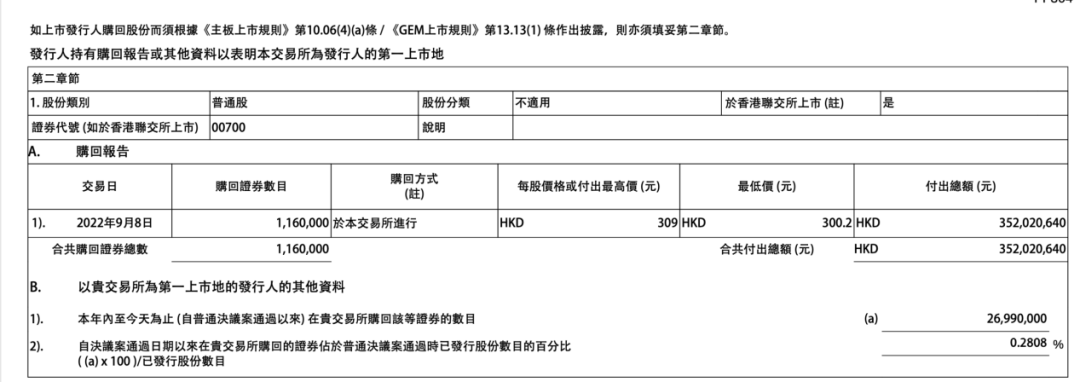有意思的是,就在9月8日当天,腾讯发布公告,公司于9月8日回购116万股,回购价格为300.2—309港元,共耗资约3.52亿港元。