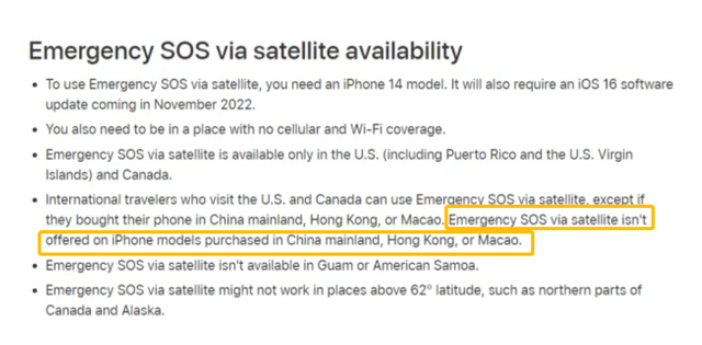 在中国大陆、中国香港或中国澳门地区购买的iPhone机型不提供通过卫星发送的紧急SOS服务。