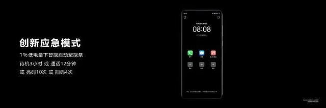 “应急模式”可以在1%的低电量的情况下,依然可以应急完成打电话、扫码等操作。