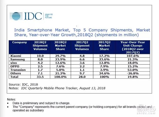 其次,目前,全球手机厂商前五的排位虽暂时稳定,但新兴的年出货量达5亿级别的市场,将会成为影响厂商全球排位的关键因素。可以说,拿下印度市场将意味着将会改变全球手机行业TOP 5的格局。