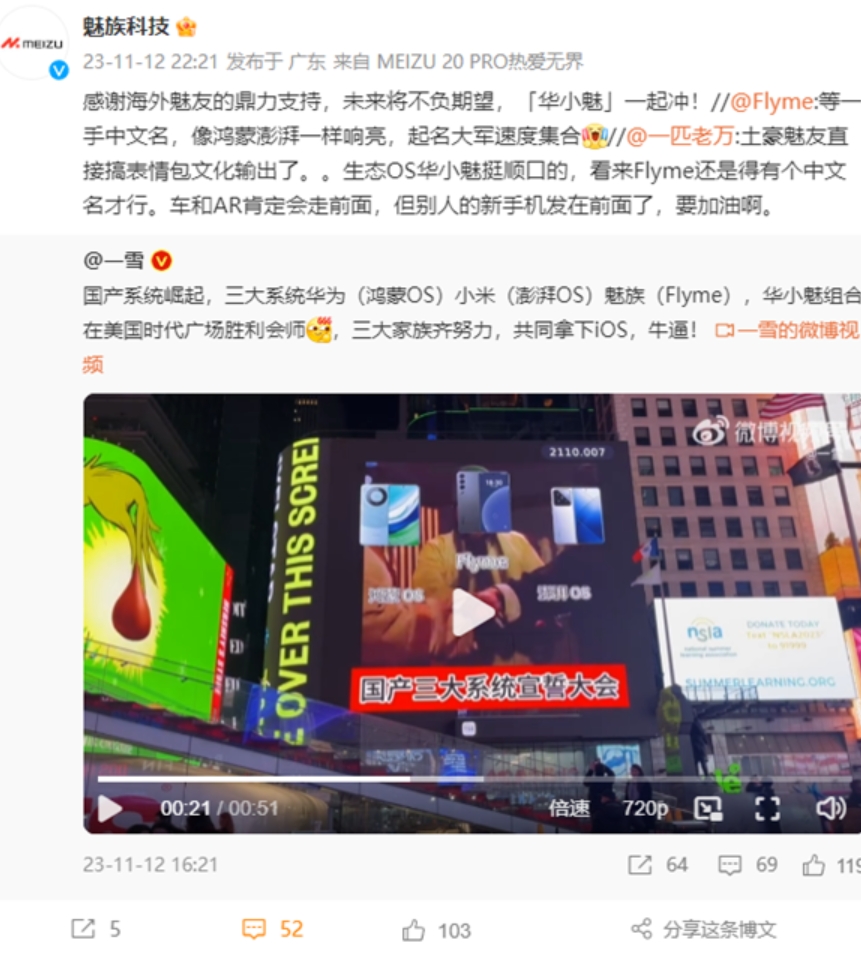 从视频来看,原本是《三国演义》中刘备、关羽、张飞桃园三结义的场面被网友二创,将华为鸿蒙OS、小米澎湃OS、魅族Flyme替换成三人。该博主表示,“华小魅组合在美国时代广场胜利会师”。