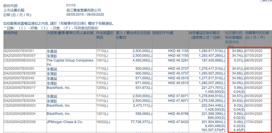 李嘉诚及李泽钜两人透过李嘉诚基金会全资拥有公司,于今年5月4日至5月7日连续四日增持,以平均价每股47.9071港元、48.0515港元、48.3737港元及48.1155港元购入长实共657.1万股。增持后,李嘉诚持有长实股权比例由34.5%增至34.68%;李泽钜持股由34.57%增至34.74%。据新浪港股统计,本次共计耗资3.16亿港元,今年以来,李嘉诚共计增持长实11.16亿港元。