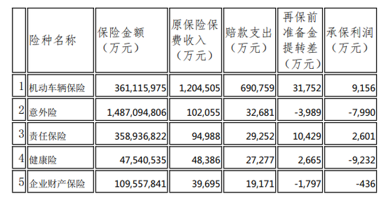 这是天安财险2019前五大险种的承保盈利状况,承保利润亏损约6000万元。期间,百亿车险实现承保利润9000万。