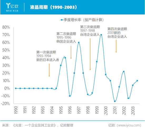 为满足这个新需求的大规模投资造成了供过于求、价格下降,带来了1993-1994年的第一次产业衰退期。在这个衰退期,松下、日立、星电等一批新的日本企业利用衰退所释放出来的技术资源进入到液晶领域。