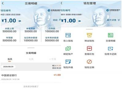 一位参与测试的用户告诉证券时报记者,注册开通后,可以用建行账户余额兑换数字货币。钱包界面显示了“存入钱包”、“转出钱包”、“交易明细”、“绑定账户”、“查看红包”、“信用卡还款”、“钱包升级”、“钱包注销”八个功能。数字钱包下线后,兑换的数字货币又转回了建行账户。