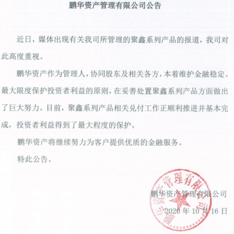 10月16日,鹏华发公告称,目前聚鑫系列产品相关兑付工作正顺利推进并基本完成,投资者利益得到了最大程度的保护。