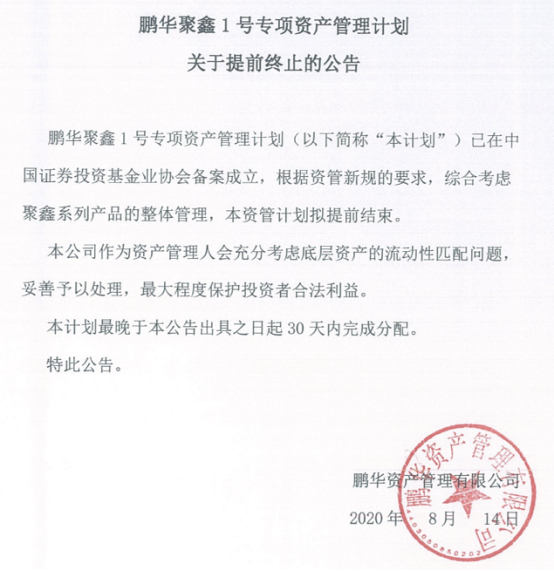 8月14日,管理人鹏华资产发布了产品提前终止公告,公告称:“根据资管新规的要求,综合考虑聚鑫系列产品的整体管理,本资管计划拟提前结束。本公司作为资产管理人会充分考虑底层资产的流动性匹配问题,妥善予以处理,最大程度保护投资者合法利益,本计划最晚于公告出具之日起30天内完成分配。”