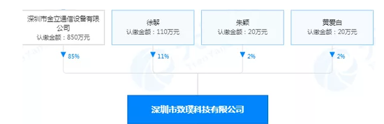 天眼查显示,致璞科技的大股东是金立(深圳市金立通信设备有限公司),其持股比例为85%,认缴出资额为850万元。
