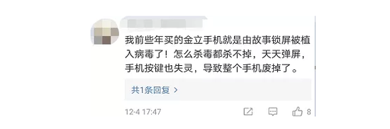 “我前些年买的金立手机就是由故事锁屏被植入病毒了!怎么杀毒都杀不掉,天天弹屏,手机按键也失灵,导致整个手机废掉了。”有网友表示。