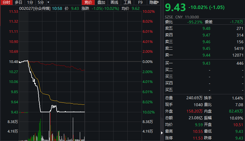 截至午间收盘,报9.43元,跌停板上仍有超万手抛单,最新市值1384亿元。