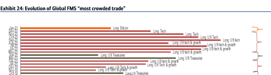 在美国银行进行的客户调查中,其合计资产达5610亿美元的客户自2017年以来首次表示,随着投机热席卷华尔街,比特币成为全世界最拥挤的交易。