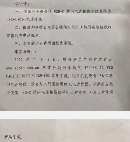2020年11月26日,杨先生将苹果公司起诉到法院,并在起诉书中提到了两点诉求:1.请求法院依法判令苹果公司将USB-C转Lightning连接线无偿更换为USB-A转闪电连接线;2.请求法院依法判令苹果公司提供与USB-A转闪电连接线相配套的充电器。