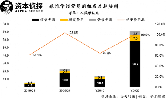 从经营费用端,可以看到跟谁学在2020年全年销售费用总投入高达惊人的58.2亿元人民币,相比2019年的10.4亿元人民币,足足高出了接近48亿。