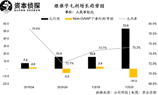在收入快速增长的同时,跟谁学在毛利端表现出了较强的成本控制能力。尽管在四季度,公司毛利率较2019年的79%,下降了7个百分点到72.1%;但从全年来看,公司2020年毛利率达到75.3%,较2019年甚至提升了0.6个百分点。