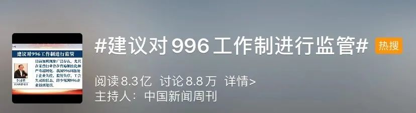 很快,以“建议对996工作制进行监管”为关键词的话题登上微博热搜,并一度冲上榜首,大批网友发言“吐槽”自己遭遇996工作制的经历。截至3月11日10时,该话题在微博获得了8.3亿阅读次数以及8.8万讨论次数。