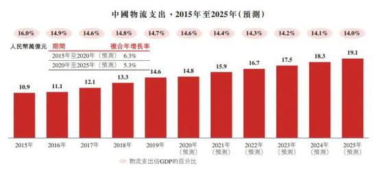 根据灼识咨询报告,中国物流支出总额预计到2025年将达到19.1万亿元。尽管市场规模庞大,中国物流市场的效率仍相对于其他发达国家较低,2019年中国物流支出占GDP的百分比为14.7%,相较于美国的7.6%及日本的8.5%仍然相对较高,一体化供应链解决方案和物流服务的市场需求巨大,京东物流未来的增长空间巨大。【责任编辑/庆华】