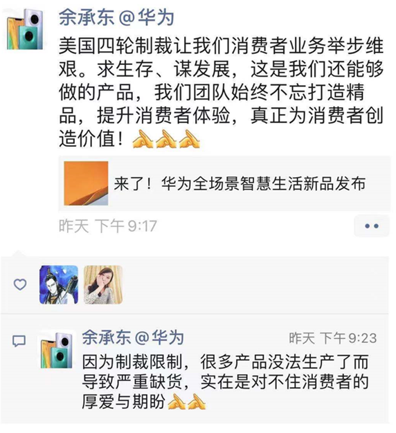 近日,华为消费者业务总裁余承东在朋友圈表示:“美国四轮制裁让我们消费者业务举步维艰。求生存、谋发展,这是我们还能够做的产品,我们团队始终不忘打造精品,提升消费者体验,真正为消费者创造价值!