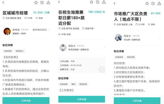 在地面获客环节中,除了地推之外,在线教育公司也开始开设线下店。招聘平台上,猿辅导旗下斑马以及字节跳动旗下大力教育都在招聘门店运营相关岗位。