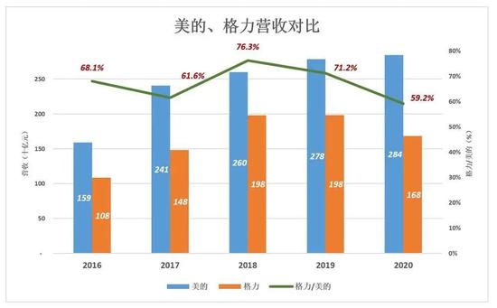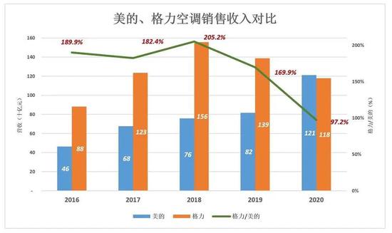 2018年,格力营收逼近2000亿,相当于美的的76.3%,但到了2020年格力1682亿营收不到美的的60%,差距再度扩大。
