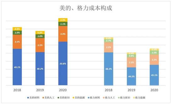 美的、格力制造成本均由材料、人工、折旧、能源四个部分构成。