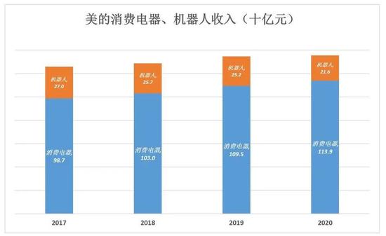 美的消费电器包括冰箱、洗衣机、厨卫及品种繁多的家电产品,2018年销售收入已达千亿级别。机器人(10.130,-0.18,-1.75%)及工业自动化板块的主体德国库卡(KUKA),美的并购后业绩缓慢下滑,2020年营收216亿,较2017年下降20%,每年下滑7.2%。