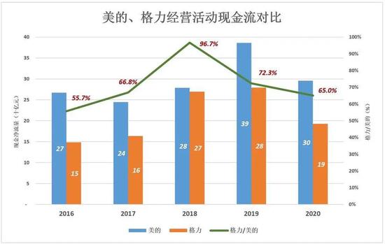 2020年,格力净利润为美的的80.6%,而经营活动现金流仅为美的的65%(2018年这个比例曾高达96.7%)。