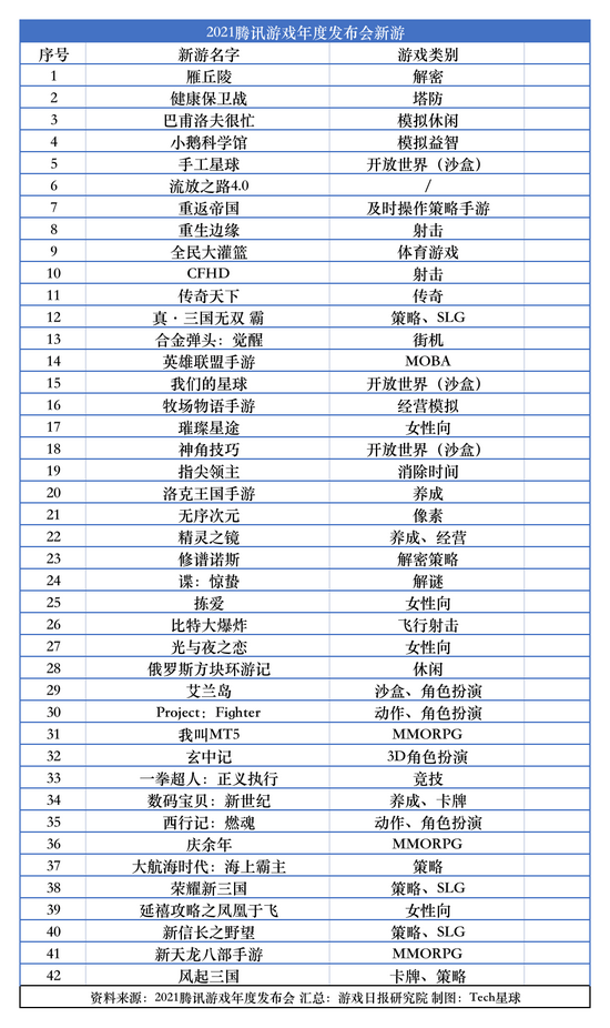 在新游方面,Tech星球梳理腾讯游戏2021年发布的数据发现,腾讯共推出42款游戏,其中休闲、射击、MMORPG等游戏占比较多,在重度游戏方面则有《英雄联盟手游》,经典IP改变重点关注的游戏则有《洛克王国手游》、《合金弹头:觉醒》等。
