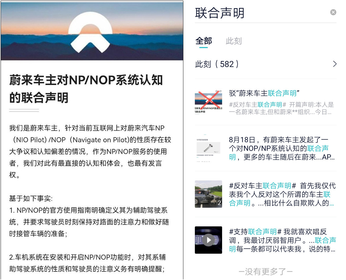 8月18日,有蔚来车主发出一则《蔚来车主对NP/NOP系统认知的声明》(以下简称《声明》),截至发稿已有超过500名车主联合签名。该声明称,蔚来车主清楚知悉目前蔚来公司的NOP/NP系辅助驾驶系统,而非自动驾驶系统或无人驾驶系统;蔚来公司对NOP/NP的介绍、宣传未对车主构成混淆和误导,并呼吁媒体报道时“能对基本的事实,概念进行了解和查证”。