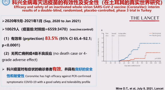 另一项研究发表在《柳叶刀》上,研究显示,科兴疫苗在土耳其的有效率达83.5%,同时没有出现因为接种疫苗而产生严重不良反应和死亡的报告。钟南山介绍,这项研究同样表明科兴疫苗对接种者有很好的保护效果,并且安全而具有耐受性。
