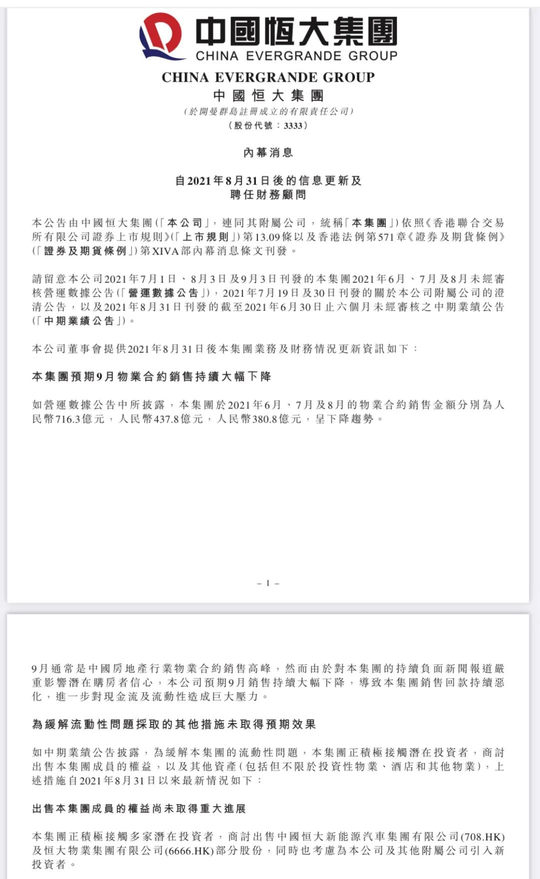 中国恒大:预期9月销售持续大幅下降