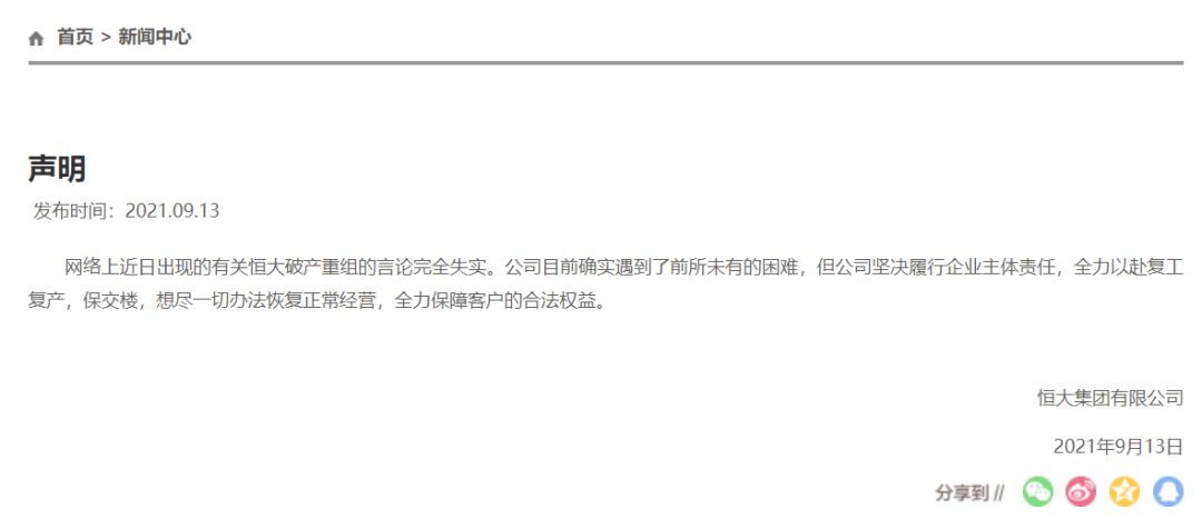 2021年9月13日,恒大集团发表声明称,网络上近日出现的有关恒大破产重组的言论完全失实。公司目前确实遇到了前所未有的困难,但公司坚决履行企业主体责任,全力以赴复工复产,保交楼,想尽一切办法恢复正常经营,全力保障客户的合法权益。