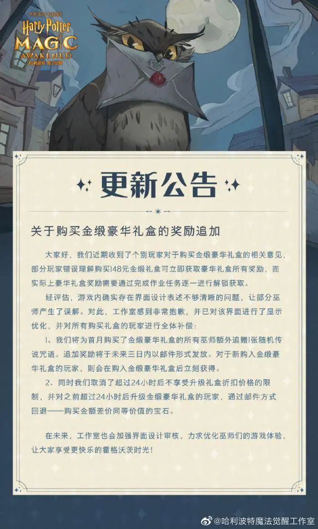 哈利波特魔法觉醒工作室表示,经评估,游戏内确实存在界面设计表述不够清晰的问题,让部分巫师产生了误解。对此,工作室感到非常抱歉,并已对该界面进行了显示优化,并对所有购买礼盒的玩家进行全体补偿。