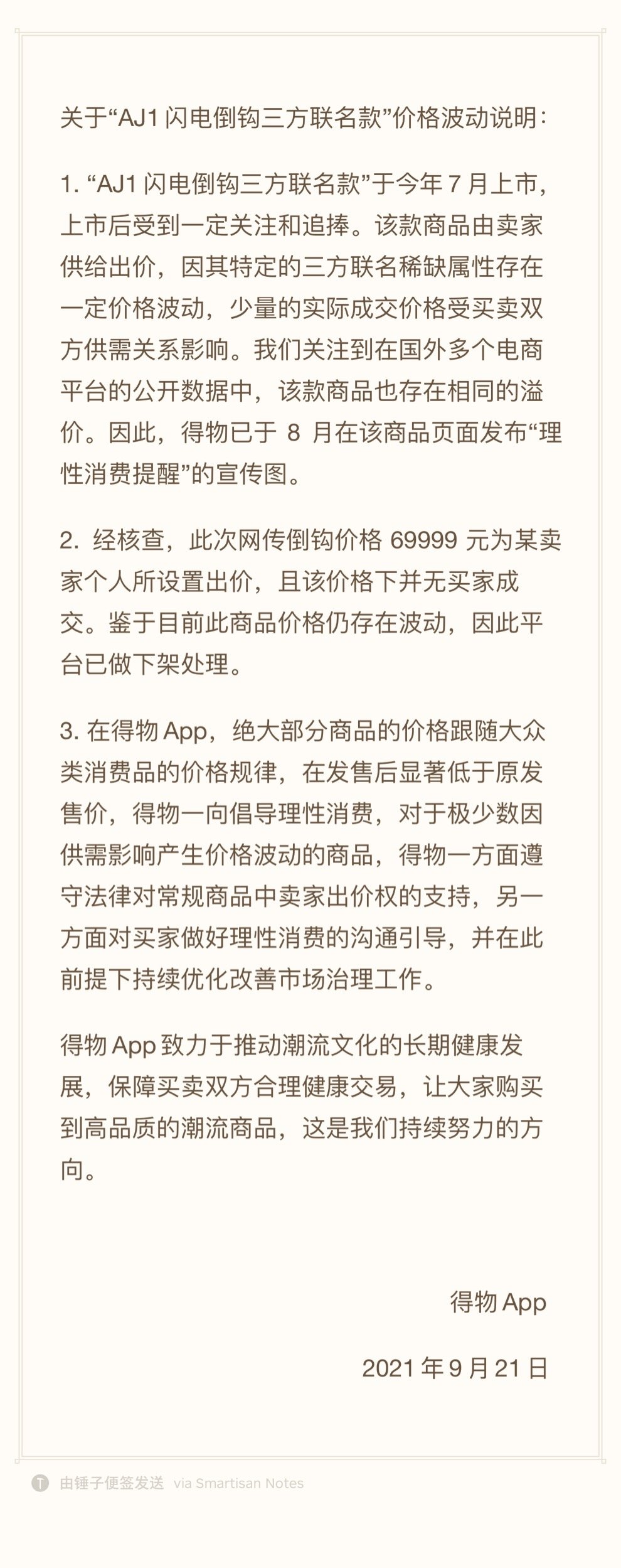 21日晚间,得物APP在微博发布《关于“AJ1闪电倒钩三方联名款”价格波动说明》。说明提到,经核查,此次网传倒钩价格69999元为某卖家个人所设置出价,且该价格下并无买家成交。鉴于目前此商品价格仍存在波动,因此平台已做下架处理。
