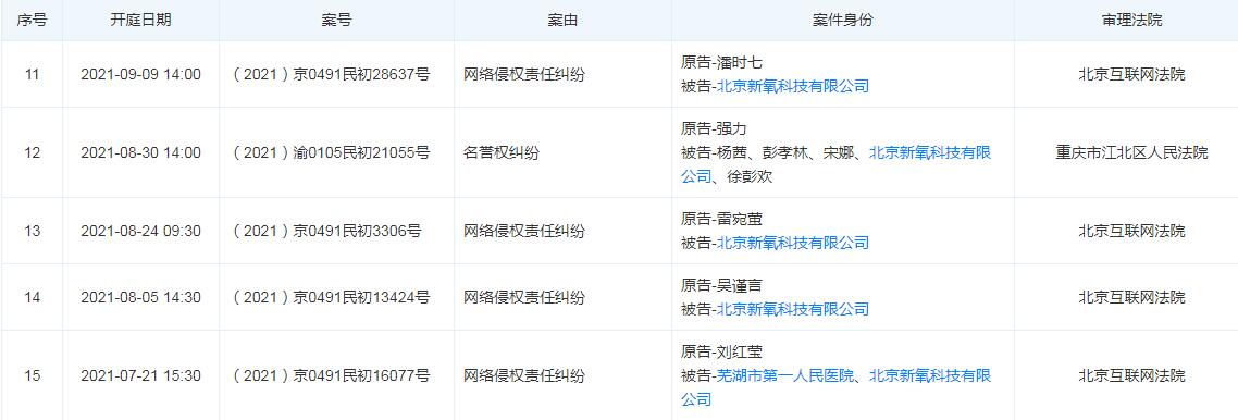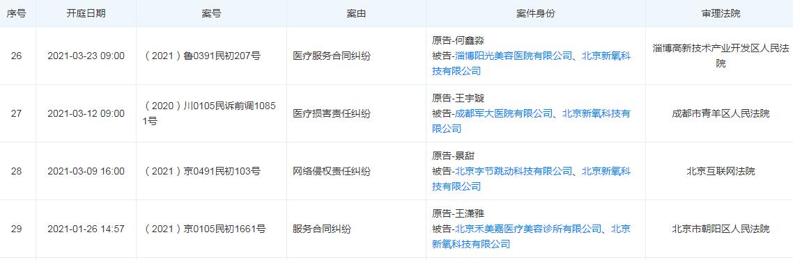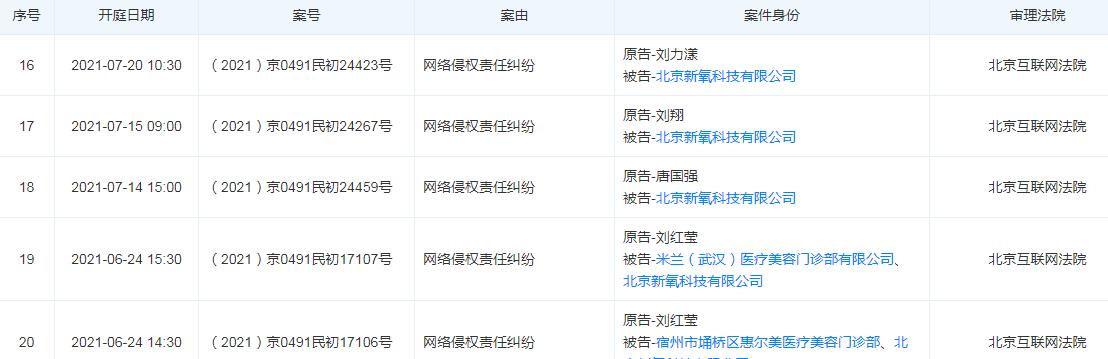 天眼查APP数据显示,自2021年以来,新氧就有29条被起诉的开庭信息。起诉明星包括吴奇隆、华晨宇、鞠婧祎、刘翔、唐国强、吴谨言、蒋梦婕、景甜、薛佳凝等。【责任编辑/江小白】