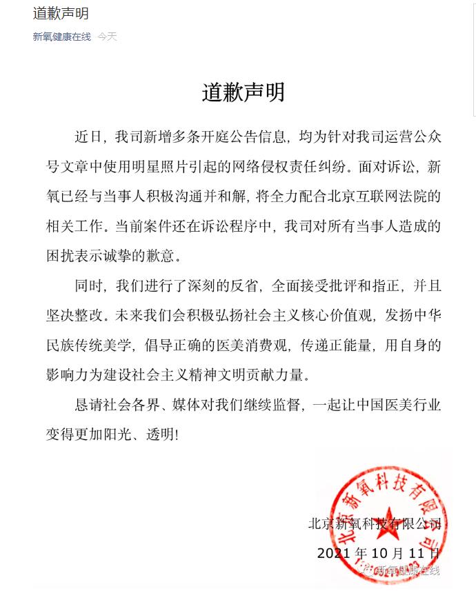 据“新氧健康在线”微信号消息,10月11日,新氧针对使用明星照片引发的网络侵权责任纠纷向当事人进行道歉。