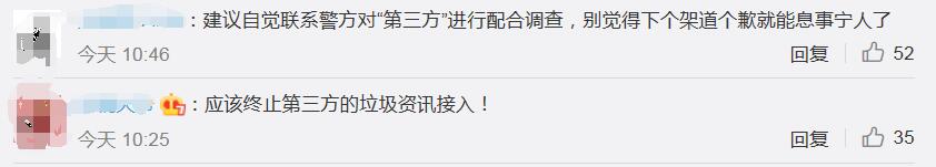 更有网友直言:“建议自觉联系警方对‘第三方’进行配合调查,别觉得下个架道个歉就能息事宁人了。”“应该终止第三方的垃圾资讯接入!”。【责任编辑/李小可】