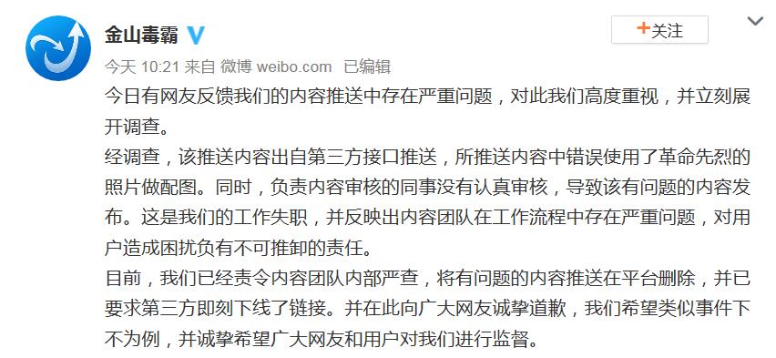 金山毒霸称,12日,有网友反馈我们的内容推送中存在严重问题,对此我们高度重视,并立刻展开调查。经调查,该推送内容出自第三方接口推送,所推送内容中错误使用了革命先烈的照片做配图。同时,负责内容审核的同事没有认真审核,导致该有问题的内容发布。这是我们的工作失职,并反映出内容团队在工作流程中存在严重问题,对用户造成困扰负有不可推卸的责任。