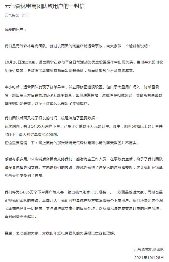 28日夜里,通过“元气头条”微信号(认证公司为“元气森林(北京)食品科技集团有限公司”),元气森林电商团队也针对此事给出公开回应,“就过去两天的淘宝店铺运营事故,向大家做一个检讨和说明”。