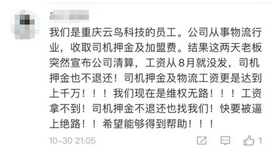 据红星资本局报道,10月31日,记者采访到了负责云鸟科技官方微博的王里(化名),她也是发布这条“特殊”微博的当事人。