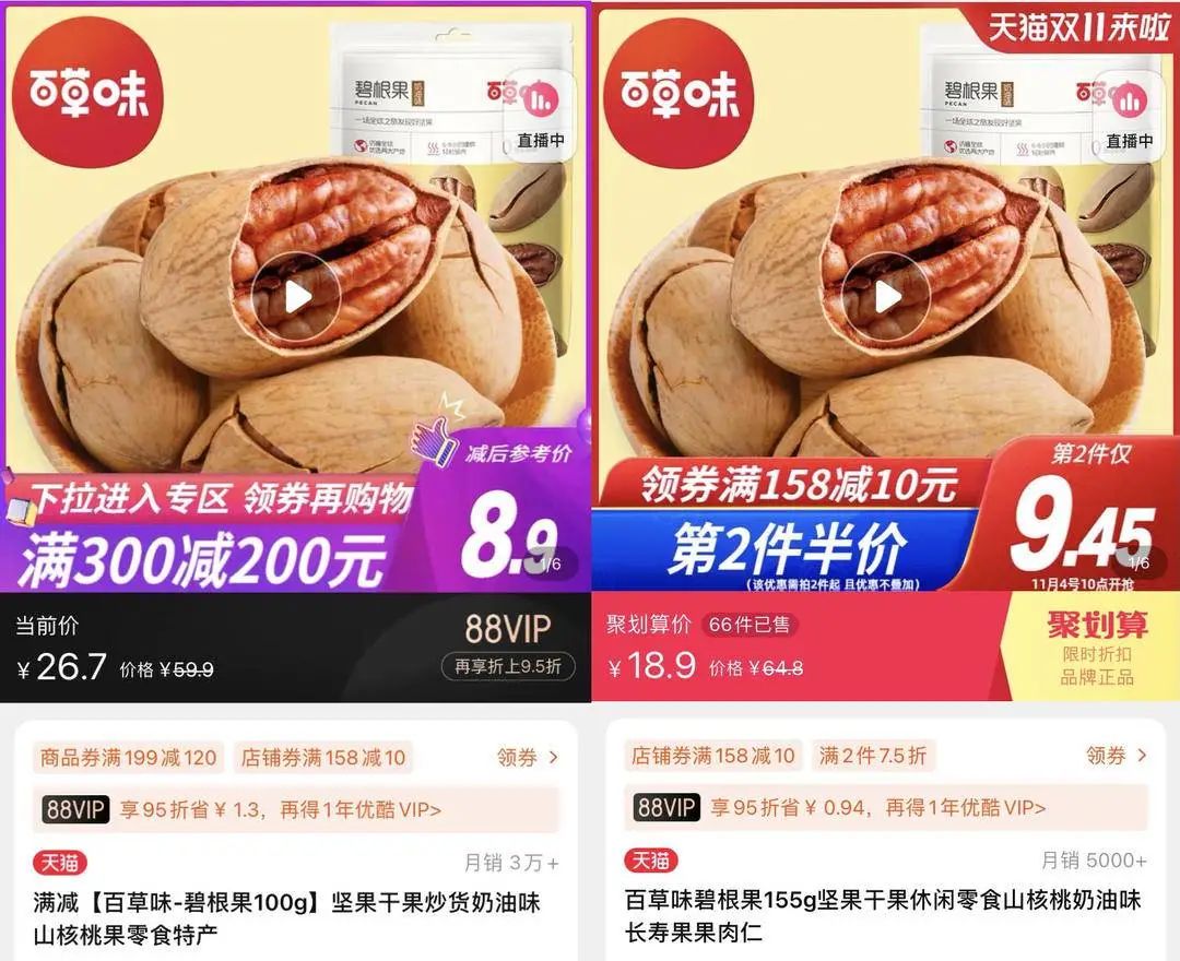 事实上,上述并不是个例。以同样的坚果零食品牌为例,百草味也有满300减200元的活动。该品牌参与满减活动的碧根果价格定到了26.7元/100g,不参与满减的碧根果价格是18.9元/155g,还可以享受第二件半价。良品铺子也不例外,参加满300减180元活动的开心果价格是44.8元/98g,不参与满减的开心果价格则是39.9元/210g。参与满减活动的这些商品,不仅价格提升了,克数还变少了。