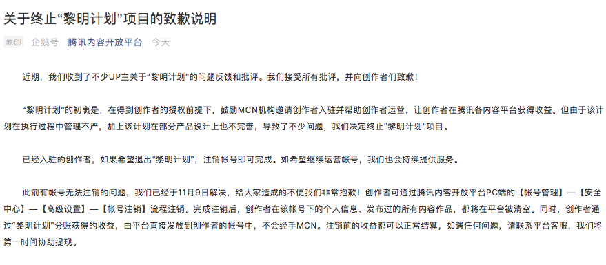 企鹅号称,“黎明计划”的初衷是在得到创作者的授权前提下,鼓励MCN机构邀请创作者入驻并帮助创作者运营,让创作者在腾讯各内容平台获得收益。但由于该计划在执行过程中管理不严,加上该计划在部分产品设计上也不完善,导致了不少问题,我们决定终止“黎明计划”项目。已经入驻的创作者,如果希望退出“黎明计划”,注销帐号即可完成。如希望继续运营帐号,企鹅号也会持续提供服务。完成注销后,创作者在该帐号下的个人信息、发布过的所有内容作品,都将在平台被清空。同时,创作者通过“黎明计划”分账获得的收益,由平台直接发放到创作者的帐号中,不会经手MCN。