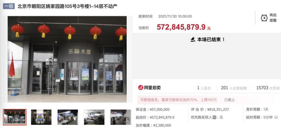 阿里司法拍卖网显示,11月30日上午10点整,北京市朝阳区姚家园路105号3号楼1-14层不动产被成功拍卖。该不动产即乐视网公司总部乐融大厦(原北京乐视大厦),此次拍卖有1.57万人围观,1人报名,唯一的竞买人北京衡盈物业管理有限公司以5.73亿元竞拍成功。
