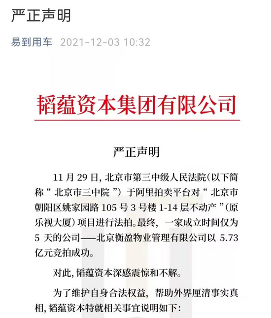 12月3日,韬蕴资本通过易到用车微信公众号就乐视大厦以5.7亿元法拍成交,发布声明称:深感震惊和不解。