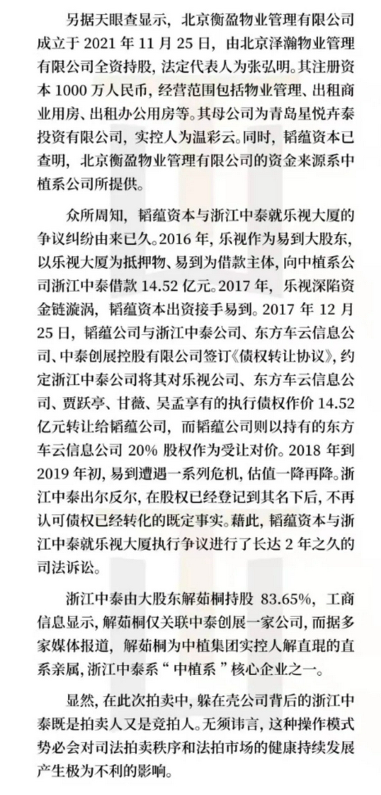 韬蕴资本在声明中称,北京衡盈物业管理有限公司的资金来源系中植系公司。韬蕴资本与中植系公司浙江中泰就乐视大厦的争议纠纷由来已久。此次拍卖中,躲在壳公司背后的浙江中泰既是拍卖人又是竞拍人。