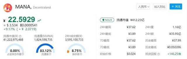 值得一提的是通过百度指数可以看到“元宇宙”这一概念在国内爆发的日期是9月初,MANA价值开始暴涨的日期是10月底开始的,价格短短一周涨幅超500%,所以资本市场的反映也并不是非常迅速,给大家留了两个月的时间差,而如果你能提早感知,抓住这两个月的时间差你就能大赚一笔,但从现在的走势来看元宇宙里的第一波红利已经过去了,如果你有投1万块变100万的想法,未来大概率是无法实现的。