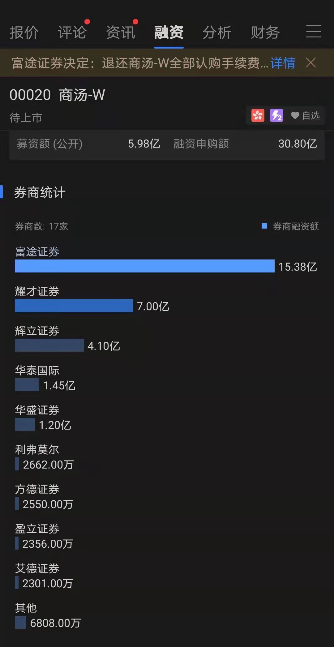 另外,云峰金融旗下的云峰有鱼证券,虽然融资额未有详细披露,也表示认购商汤相关客户的认购手续费及银行融资利息均由云峰证券承担,退款方式与时间随后公布。