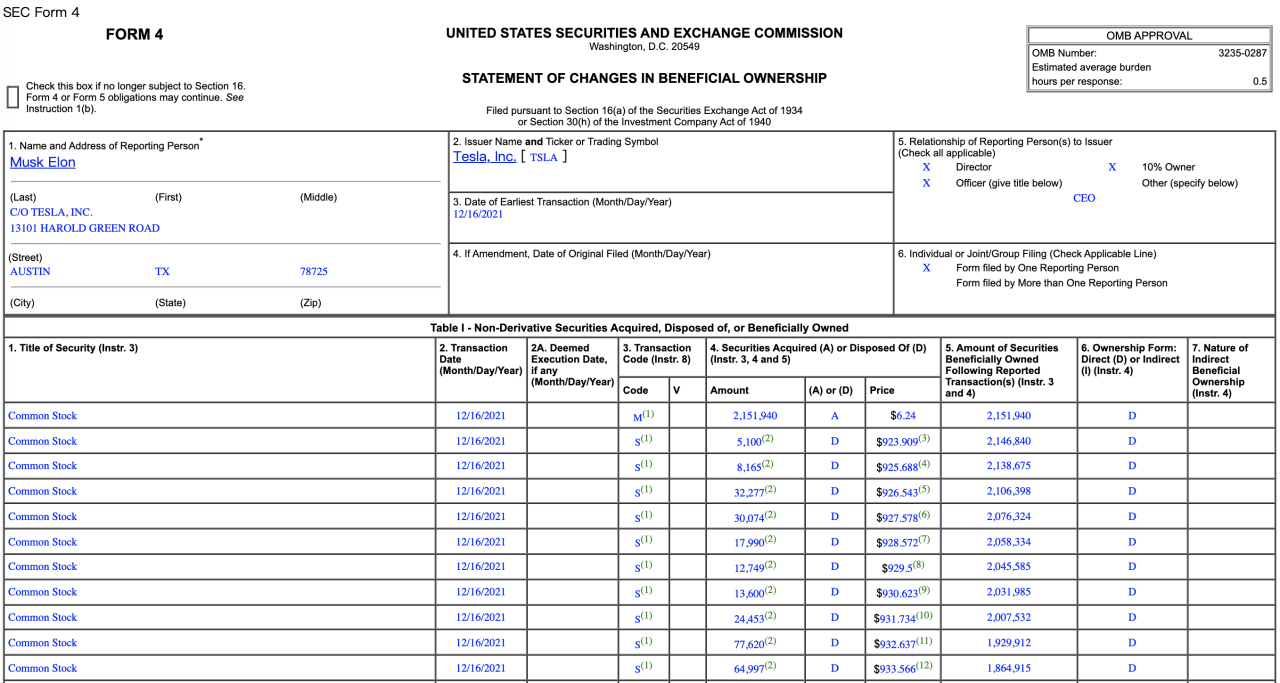 据美国证交会文件显示,马斯克于12月16日以6.24美元的价格行使了2151940份期权,并以923美元至994美元的价格出售了934091股股票特斯拉股票,价值约8.84亿美元。此次股票出售,仍是旨在满足行使期权的预扣税义务。