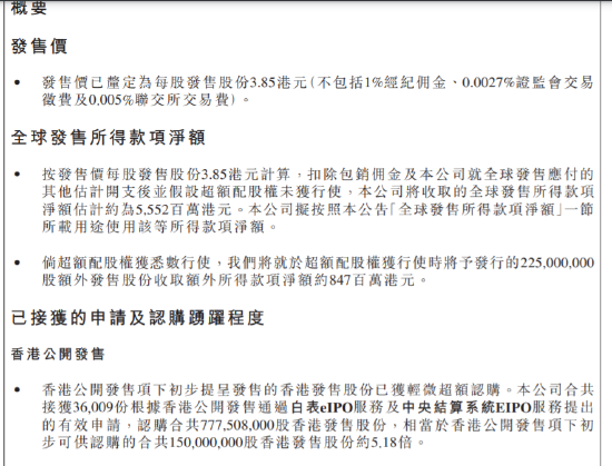 公司合共接获36,009份有效申请,认购合共7.775亿股香港发售股份,相当于香港公开发售项下初步可供认购的香港发售股份约5.18倍。国际发售项下初步提呈发售的发售股份已获适度超额认购,相当于国际发售项下初步可供认购的发售股份总数约1.5倍。