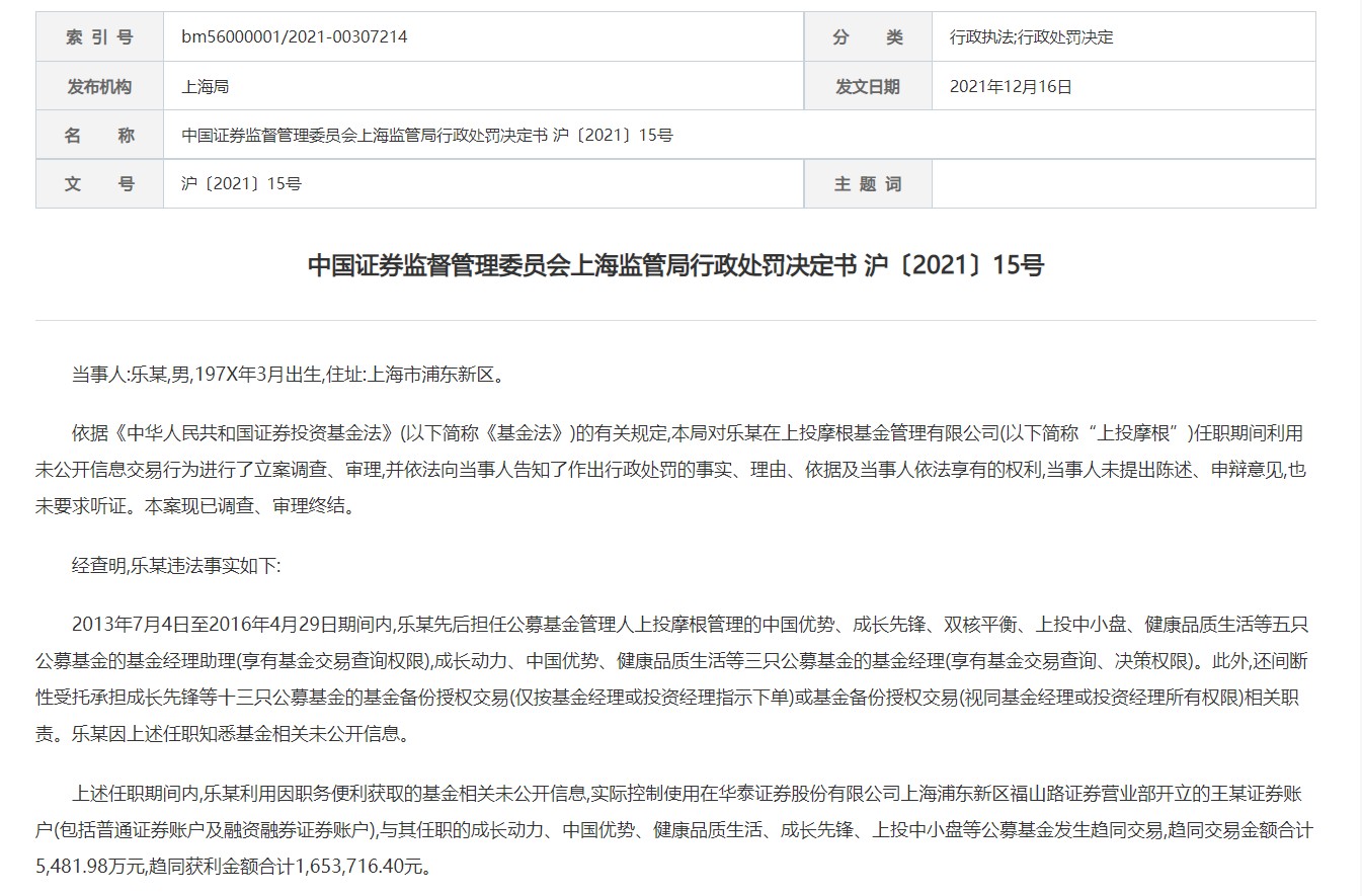 上述任职期间内,乐某利用因职务便利获取的基金相关未公开信息,实际控制使用在华泰证券股份有限公司开立的王某证券账户(包括普通证券账户及融资融券证券账户),与其任职的成长动力、中国优势、健康品质生活等公募基金发生趋同交易,趋同交易金额合计5,481.98万元,趋同获利金额合计1,653,716.40元。